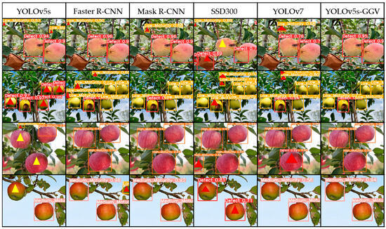 To assess the effectiveness of the improved YOLOv5s-GGV network model in apple target detection, comparative experiments were conducted with five prevalent convolutional neural networks, YOLOv5s, Faster R-CNN, Mask R-CNN, SSD512, and YOLOv7, using an orchard apple dataset. The results are presented in Table 6. Figure 15 illustrates the comparison of the original YOLOv5s network and the improved YOLOv5s-GGV network for high, medium, low maturity, and defective fruit categories. The detection results for these four categories are color-coded, with red triangles marking false positives and yellow triangles marking false negatives.