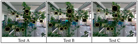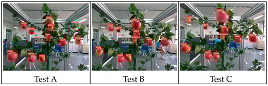 To validate the accuracy of fruit size determination after distortion removal and depth filtering, this study collected 10 apples as research subjects and measured their actual diameters. Referring to the national standard GB/T 10651-2008 for fresh apples’ size classification, three diameter thresholds were established: 85 mm, 80 mm, and 75 mm. Classifications were defined as follows: apples with a diameter (R) greater than or equal to 85 mm were considered first-grade, those with 80 mm ≤ R < 85 mm were second-grade, 75 mm ≤ R < 80 mm were third-grade, and those with R < 75 mm were fourth-grade. Initially, the actual diameters of the apples used in the experiment were measured using calipers and sequentially numbered. The experiment was conducted three times with randomized apple positions. We conducted three experiments on a randomly shuffled selection of ten apples, testing the accuracy of algorithms measuring the diameter of the same apple at different positions in the image. This was done to verify the effectiveness of image distortion correction. Figure 16 displays the colored images and detection results obtained by the camera in three experimental runs. Figure 17 illustrates the effectiveness of the algorithm in extracting fruit contours during the processing steps.