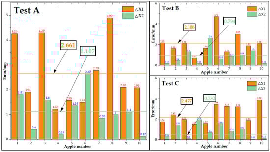Absolute error in apple diameter measurement by the algorithm (∆X1: absolute error between algorithmic and actual diameter measurements before image processing; ∆X2: absolute error between algorithmic and actual diameter measurements after image processing).