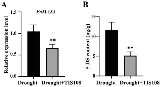 FaMAX1 expression and 5-DS content after TIS108 treatment. (A) Expression of FaMAX1 in drought and drought + TIS108 treatment groups; (B) 5-DS content in drought and drought + TIS108 treatment groups. Data represent mean ± SEM; ** p < 0.01.