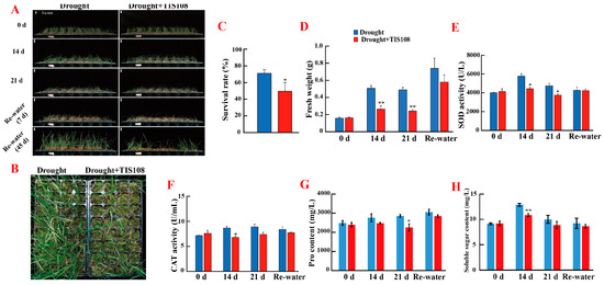 Inhibiting SL synthesis under drought decreased drought tolerance of tall fescue. (A,B) Photograph of the drought- and drought + TIS108-treated tall fescues subjected to drought stress for different times and then rewatered for one week and 45 d. (C) Survival rate statistic under drought and drought + TIS108. (D) Fresh weight under drought and drought + TIS108. SOD and CAT activity (E,F) and proline and soluble sugar content (G,H) under drought and drought + TIS108. Dates represent mean ± SEM; asterisks indicate significant differences as determined by t test (* p < 0.05, ** p < 0.01). Each experiment was repeated at least three times.