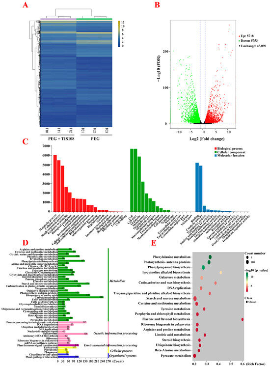 Transcriptome analysis of the PEG and PEG + TIS108 groups. (A) Hierarchical cluster analysis of the PEG and PEG + TIS108 groups. (B) Volcano plot of the PEG and PEG + TIS108 groups. (C) GO annotation of the PEG and PEG + TIS108 groups. (D) KEGG pathway analysis of the PEG and PEG + TIS108 groups. (E) Enrichment in KEGG pathways of the PEG and PEG + TIS108 groups.