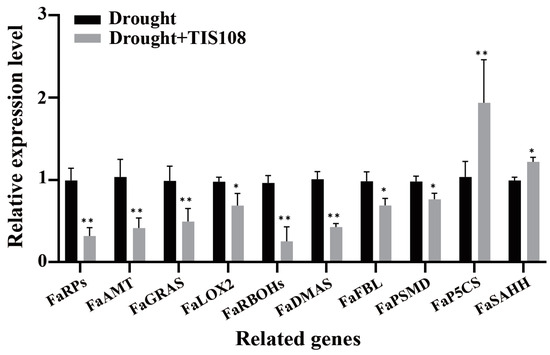 FaRPs, FaAMT, and FaGRAS play important regulatory roles in root morphogenesis and development, as well as root hair elongation and growth. Therefore, we further verified the expression patterns of these genes under drought and drought + TIS108 conditions using qRT-PCR. The results revealed that the expression of these genes significantly changed due to TIS108 treatment (Figure 5). Among these, FaRPs, FaAMT (root morphogenesis), FaGRAS (root development), FaRBOHs, FaDMA (root cell differentiation), and FaFBL (root hair development) were significantly downregulated. Nevertheless, the expressions of FaP5CS and FaSAHH, which negatively regulate root development, were significantly upregulated (Figure 5).