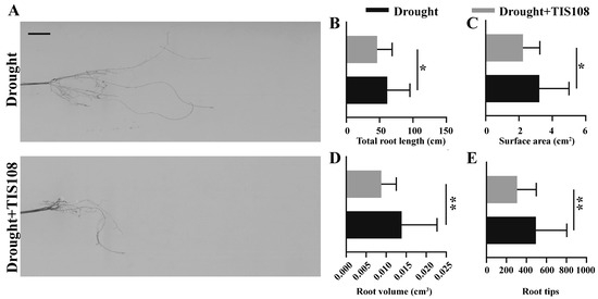 Root growth under drought and drought application of TIS108. Photograph (A), total root length (B), root surface area (C), root volume (D), and root tips (E) of three-week-old tall fescues from drought and drought + TIS108 treatment groups. Data represent mean ± SEM, * p < 0.05, ** p < 0.01. Bar represents 1 cm.