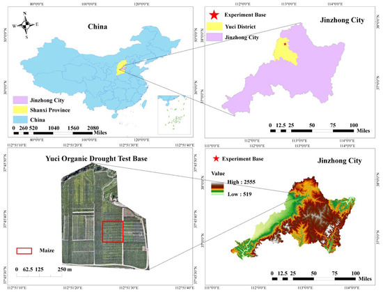 The study was conducted from 9 May to 30 September 2023, at the Yuci Lifang Organic Dry Farming Experimental Base in Jinzhong City, China (37°51′ N, 112°45′ E); the area planted with maize is 80 m2 (10 m × 8 m), as shown in Figure 1. This location is characterized by a warm temperate continental climate, distinct seasonal changes, significant diurnal temperature variations, and prominent arid to semi-arid conditions. Annually, the site receives 2000 to 3000 h of sunshine, has an evaporation rate of 1500 to 2300 mm, a frost-free period of 120 to 220 days, and an elevation ranging from 767 to 1777 m. The annual average temperature is 9.8 °C, with uneven precipitation distribution totaling 418 to 483 mm.