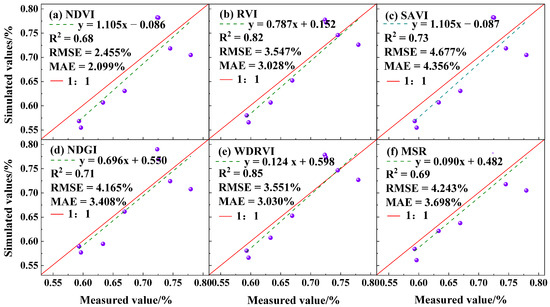 Comparison of Simulated and Observed Values of Canopy Leaf Water Content using NDVI (a); RVI (b); SAVI (c); NDGI (d); WDRVI (e); MSR (f).