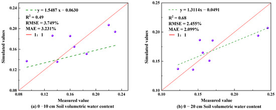 We analyzed simulated and observed data from linear models correlating maize canopy leaf water content with soil moisture at depths of 0–10 cm and 0–20 cm (Figure 4). The linear model for soil moisture at 0–20 cm depth exhibited the lowest RMSE and MAE, recorded at 2.455% and 2.099%, respectively. Based on various statistical measures, including R2, RMSE, and MAE, we selected the linear model relating maize canopy leaf water content to soil moisture at 0–20 cm depth to quantify the relationship between leaf water content and surface soil moisture.