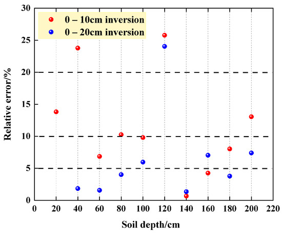 We analyzed simulation and measurement data from the linear model that inverts soil moisture content in the 0–200 cm range, using data from 0–10 cm and 0–20 cm soil layers (Figure 5). For the 0–10 cm depth range inversion, most Relative Error (RE) values are below 10%, suggesting high accuracy in model predictions for this range. However, RE values exceed the 10% threshold at depths like 20 cm, 40 cm, 80 cm, 120 cm, and 200 cm, pointing to reduced model predictive performance at these levels. For the 0–20 cm depth range inversion, relative errors mostly stay below 10%, except for 120 cm, which exceeds 20%. This suggests that data from this range yield more accurate soil moisture predictions. Inversion results for soil moisture in the 0–20 cm depth range are generally more accurate than those for the 0–10 cm range.