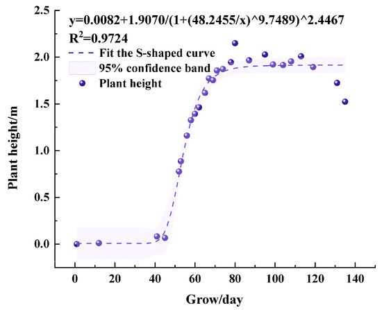 Maize plant height growth followed an “S”-shaped curve, with slow initial growth, an acceleration phase, and a slowdown or plateau in the final stages, as depicted in Figure 6. With an R2 value of 0.9724, the plant height model shows a strong correlation with actual observations, accurately depicting maize height changes over time. Average maize heights during the mid to late growth stages were derived from UAV elevation data, as shown in Table 7.