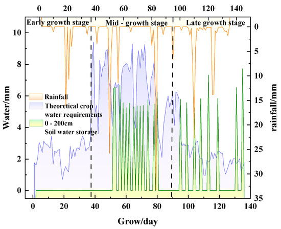 Given the variability in water requirements across different growth stages, irrigation strategies must be dynamically tailored to the crops’ actual needs to mitigate drought stress. Optimal irrigation management, based on crop water demand and rainfall patterns, ensures efficient water resource use and maintains the necessary water balance for crop growth. Developing and adjusting irrigation schedules scientifically, considering factors like crop growth stage, rainfall, and soil water storage, is essential.