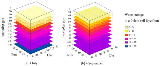 The study area exhibited a layered soil moisture distribution across the 0–200 cm profile, as shown in Figure 9. We analyzed soil moisture distribution on 3 July and 4 September 2023. Dark blue areas in the figure indicate higher moisture storage in deeper soil layers. The yellow areas denote lower moisture storage in the shallow soil layers. Lower moisture storage in the top soil layer, compared to deeper layers, is attributed to easier evaporation and crop absorption at the surface. Soil moisture distribution shows significant temporal variations. These variations are linked to precipitation, evaporation, and crop uptake. On 4th of September, water storage at both 60 cm and 40 cm depths exceeded levels on 3rd of July. Soil moisture’s potential energy depends on depth and water content. Higher moisture in deeper layers implies slower water movement through the soil, necessitating greater root pressure for uptake due to the water’s higher potential energy.