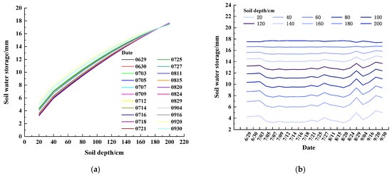 Moisture storage in the 0~d cm soil layer of maize at 22 days. Display by Soil Depth (a); Display by Date (b).