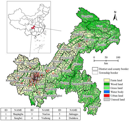 Chongqing is located in southwest China and is at the heart of the Three Gorges Reservoir area, as shown in Figure 1. It is an essential ecological barrier in the upper reaches of the Yangtze River. Chongqing is also the core of national economic strategies such as the Chengdu–Chongqing Twin Cities Economic Circle and the Western Land–Sea New Corridor. It plays a pivotal role in the economic development and ecological environment protection of the entire Yangtze River basin. Chongqing has a land area of 8.24 × 104 km2, making it the most prominent mountain city in China. It belongs to the typical category of large cities, large mountainous areas, and large rural areas. The Chongqing Municipal Government has conducted ecological restoration and governance work to address environmental pollution issues. In 2022, the city added 1617 km2 of water and soil loss control area; the coverage rate of green pest control for major agricultural crops reached 51.76%; and the coverage area of livestock tail water treatment in the city reached 90,000 mu. These efforts have to some extent eased the conflict between economic development and environmental protection (data from the “2022 Chongqing Ecological Environment Status Bulletin” released by the Chongqing Municipal Bureau of Ecology and Environment (https://sthjj.cq.gov.cn, accessed on 10 December 2023). However, with the rapid economic development in the region, the contradictions between agricultural planting, economic growth, and ecological protection will gradually intensify. There are 39 districts and counties and 1035 townships in Chongqing, with complex terrain, a variable climate, multiple soil types, and abundant plant types. It is challenging to solve the problem of ANPSP in identifying districts and counties, and it is tough to prevent and control it in various townships accurately. In addition, due to the complex terrain, variable climate, diverse soil types, and rich planting types in the region, the current ANPSP problem is difficult to control over a large area. Therefore, accurately identifying key control areas is a critical problem that needs to be solved.