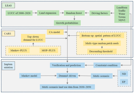 The PLUS model is software developed by the High-Performance Spatial Computing Intelligent Laboratory (HPSCIL) of the China University of Geosciences (Wuhan) (https://www.urbancomp.net/archives/plus, accessed on 20 August 2023). The model mainly simulates future land use-type data under different scenarios in the study area by using the rule mining framework (LEAS) based on land expansion analysis and the CA model (CARS) based on a multi-type random seed mechanism [28]. The model considers the complexity and micro-nature of the macro-driving factors of the land use system, thus improving the simulation accuracy of the model. The flowchart for land use simulation in this study is shown in Figure 2.