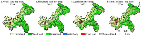 Comparison of simulated and actual land use in Chongqing in 2010 and 2020. (a) is the actual land use situation in 2010; (b) is the simulated land use situation in 2010; (c) is the actual land use situation in 2020; and (d) is the simulated land use situation in 2020.