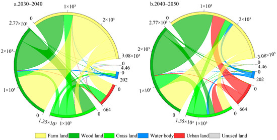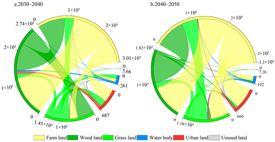 Land use transition matrix under the ND (unit: km2). (a) is the result from 2030 to 2040; (b) is the result from 2040 to 2050.