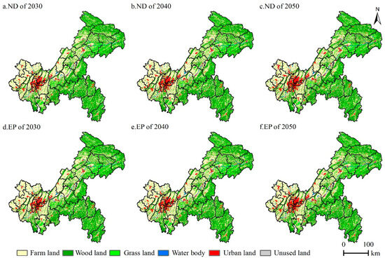 Simulation results of land use types under two development scenarios in 2030–2050. (a–c) is the result of ND; (d–f) is the result of EP.