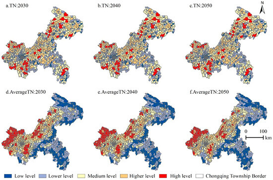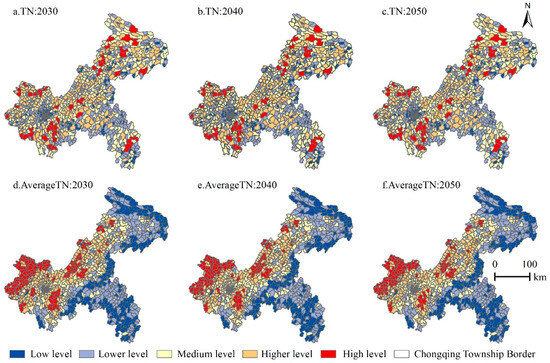 Distribution of average TN and TP load levels for each township under the ND (TP trend is consistent). (a–c) respectively represent the load situation of TN 2030–2050; (d–f) respectively represent the average load situation of TN 2030–2050.