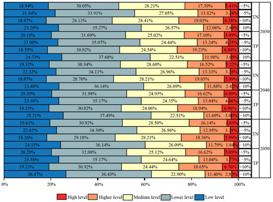 From 2030 to 2050, the TP pollution load remained stable in the low-level, lower-level, medium-level, and higher-level zones, with the annual average percentage of grade numbers being 22.16%, 32.98%, 25.60%, and 14.20%, respectively. The high-level zone showed a downward trend, with the number of zones accounting for 5.31%, 5.12%, and 4.73% in 2030, 2040, and 2050, respectively. Among them were three townships with an increase of more than 1.00 × 103 kg, namely Zhonggang Township, Mawu Township, and Fushou Township. The grades remained unchanged. There were 17 townships with a decrease of more than 1.00 × 103 kg, with Shima Township having the largest decrease, but it remained in the high-level zone.