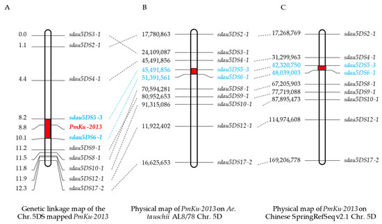 Mapping of PmKu-2013. (A) Linkage map of PmKu-2013 using the F2 families of DHKu-2013 × DH2147; (B) PmKu-2013 on the Aegilops tauschii (cv. AL8/78) chromosome. The numbers on the left side of (B) represent the physical location of the right marker on the AL8/78; (C) PmKu-2013 on the Chinese Spring RefSeq v2.1. The numbers on the left side of (C) represent the physical location of the right marker on the Chinese Spring. Intervals of PmKu-2013 localization are marked in red in figure. The markers marked in blue font in figures (A–C) are the closest markers on either side of the PmKu-2013.