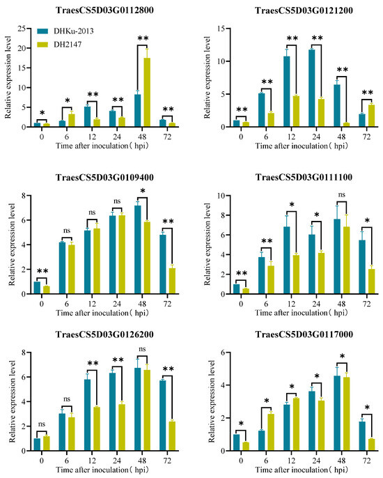 The resistance genes selected from the database of Aegilops tauschii Aet5 (AL8/78) also exist in the Chinese Spring gene (RefSeq v2.1) and will be used as the genes to focus on in the future. There are a total of 77 high-confidence genes within the genetic interval of AL8/78, and they all have corresponding homologous genes on the CS, respectively (Table S3). Scanning the annotation information for 77 high-confidence genes uncovered six high-confidence genes potentially linked to disease resistance, encompassing four genes with R-gene structures, one gene encoding a galacturonic acid-binding cell wall receptor kinase, and one gene encoding a protein related to pathogen attack and keratinization (Table 3). We examined the expression patterns of these genes in the resistant parent DHKU-2013, and the susceptible parent DH2147 following exposure to Bgt isolate E09 at various time points utilizing qRT-PCR. As shown in Figure 4, all genes exhibit an induced expression trend within the parental materials, with varying degrees of induction. For instance, TraesCS5D03G0121200 shows significantly higher induction strength in the resistant parent material relative to the susceptible material. In contrast, TraesCS5D03G0112800, despite fluctuating parental expression levels over the first 48 h, exhibits a significant increase in expression in the susceptible material after 48 h compared to the resistant parent material. Further research is required to identify the candidate gene for PmKu-2013.