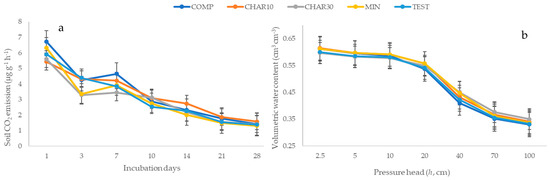 Soil organic amendments, such as compost and biochar, play a crucial role in providing essential nutrients, restoring soil fertility, and re-establishing microbial populations. In addition, amendment application could allow carbon storage in the soil, converting it into more stable forms and decreasing CO2 loss in the atmosphere [7]. Compost is the product deriving from the aerobic decomposition (composting) of solid raw organic materials, such as yard trimmings, food residuals, or animal by-products, offering an effective solution for managing and recycling large amounts of organic materials [8]. The microbial bio-oxidation process requires a proper carbon to nitrogen ratio, a favorable temperature regime, and an optimal water and air content, to convert organic biomasses into a stabilized material suitable for soil amendment [9,10]. Usually, compost is characterized by a low decomposition rate and by a slow release of organically bound nutrients, making compost less susceptible to large nutrient losses. Biochar is the carbonaceous residue of pyrolyzed organic materials or biomass (particularly agricultural residues) and it is predominantly stable and recalcitrant. Due to its stability, biochar can be used for increasing soil carbon (C) sequestration [11,12,13,14], soil remediation [15,16], greenhouse gas emission mitigation [17,18], and improving soil fertility and crop yield [11,19,20]. In addition, biochar’s highly active surface area and functionality contribute to improving soil quality through positive effects on soil’s structure, chemical, and biological properties. For these reasons, biochar represents a suitable solution for degraded soils to alleviate problems caused by alkalinity, acidity, nutrient deficiency, and metal toxicity [6,11]. However, the chemical and physical properties of biochar may vary significantly depending on feedstocks and production methods and temperatures [11]. Wang et al. [21], in their review, highlighted that the decomposition rate of biochar in the soil depends on the feedstock, the pyrolysis conditions, and soil properties, with particular regard to textural characteristics. Wood-derived biochar showed a low decomposition rate, likely due to the inert properties of feedstock such as the high lignin content, whereas biochar obtained from crops and grasses was generally more degradable [22,23]. In addition, the decomposition rate decreased with increasing pyrolysis temperature [24,25] and a slower decomposition rate was observed in soils with high clay content. Soil moisture plays an important role in biochar degradation, increasing significantly under unsaturated or alternating saturated–unsaturated conditions [21].