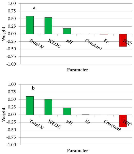 Standardized regression coefficients for predictors (pH, EC, TOC, WEOC, and Total N) in the multiple linear regression model predicting wheat grain yield (a) and protein yield (b). The green color indicates a positive effect of the examined soil variables on crop performance; the red color indicates a negative effect.