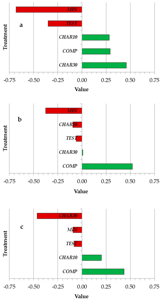 Additionally, Pearson correlation coefficients were computed to examine the relationships between tested treatments and soil properties (Figure 3a–c). Mineral fertilizer and the unfertilized control displayed inverse relationships with TOC (−0.68 and −0.35, respectively, Figure 3a), while compost and biochar treatments exhibited positive associations (0.28, 0.29, and 0.46 for CHAR10, compost, and CHAR30, respectively). For total N (Figure 3b), mineral fertilizer exerted a negative effect on this soil parameter, conversely to the compost behavior. Regarding WEOC (Figure 3c), CHAR30 exhibited an inverse correlation, while compost and CHAR10 demonstrated favorable relationships. The Pearson correlation coefficients for WEOC were very small for mineral fertilizer, but not negligible for compost and biochar at the highest rate.