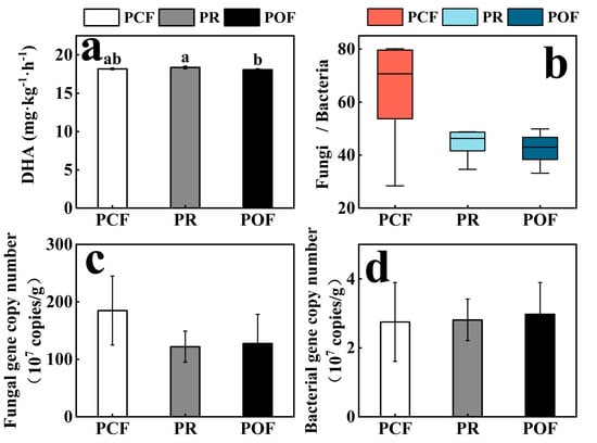 Compared to the PCF treatment, the POF and PR treatments showed similar effects on soil dehydrogenase activity. The soil dehydrogenase activity of the PR treatment was significantly higher, by 1.6%, compared to the POF treatment (Figure 2a). Compared with the PCF treatment, the PR and POF treatments tended to decrease the absolute abundance ratio of fungi and bacteria (Figure 2b), although there were no significant differences in the absolute abundance of soil bacteria and fungi among the three treatments (Figure 2c,d).