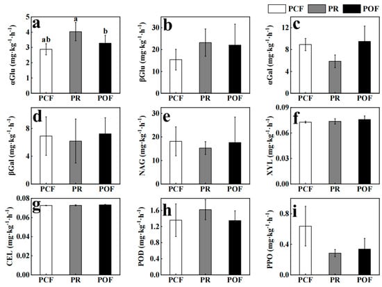 The activity of the most tested soil enzymes related to carbon transformation did not vary significantly under the PR and POF treatments, including β-glucosidase, β-N-acetyl-glucosaminidase, α-galactosidase, β-galactosidase, polyphenol oxidase, peroxidase, xylanase, and cellulase (Figure 3b–i). The activity of α-glucosidase in the PR plots was significantly higher than that in the POF plots. There were no significant differences in soil α-glucosidase activity between the PCF and PR or POF plots.