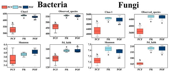Effects of low-dose organic fertilizer on alpha diversity of soil bacterial and fungal communities. Note: PCF: chemical fertilizer application; POF: organic fertilizer application; PR: organic fertilizer replaces 50% chemical fertilizer. Different lowercase letters indicate significant differences between treatments (p < 0.05).