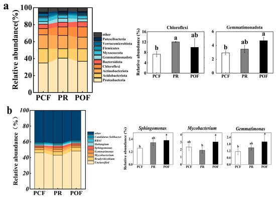 Effects of low-dose organic fertilizer produced by high-temperature aerobic fermentation on the relative abundance of soil bacteria at the phylum (a) and genus (b) levels. Note: PCF: chemical fertilizer application; POF: organic fertilizer application; PR: organic fertilizer replaces 50% chemical fertilizer. Different lowercase letters indicate significant differences between treatments (p < 0.05).