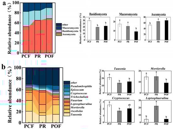 Effects of low-dose organic fertilizer produced by high-temperature aerobic fermentation on the relative abundance of soil fungi at the phylum (a) and genus (b) levels. Note: PCF: chemical fertilizer application; POF: organic fertilizer application; PR: organic fertilizer replaces 50% chemical fertilizer. Different lowercase letters indicate significant differences between treatments (p < 0.05).