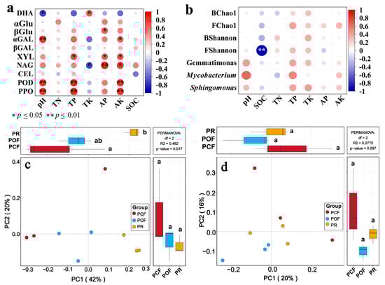 Correlation analysis between soil chemical properties and enzyme activities (a). Correlation analysis between soil chemical properties and microbial communities (b). Principal coordinate analysis (PCoA) of bacteria and fungi in organic fertilizer-applied soil. Note: PCF: chemical fertilizer application; POF: organic fertilizer application; PR: organic fertilizer replaces 50% chemical fertilizer. SOC: organic carbon; TN: total nitrogen content; TP: total phosphorus content; TK: total potassium content; AP: available phosphorus content; AK: available potassium content; DHA: dehydrogenase; αGlu: α-glucosidase; βGlu: β-glucosidase; αGAL: α-galactosidase; βGAL: β-galactosidase; NAG: β -N-acetyl-glucosaminidase; XYL: xylanase; CEL: cellulase; PPO: polyphenol oxidase; POD: peroxidase; BChao1: Bacterial Chao1; FChao1: Fungus Chao1; BShannon: Bacterial Shannon; FShannon: Fungus Shannon. Different lowercase letters indicate significant differences between treatments (p < 0.05).