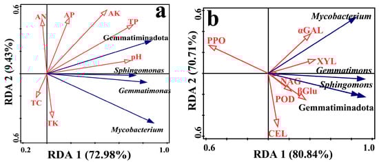 The soil chemical properties and enzyme activities were considered as explanatory variables, while the relative abundance of dominant phyla was used for redundancy analysis (Figure 8). The explanatory rate of RDA 1 in the redundancy analysis of the dominant soil bacteria and chemical properties was 72.79%, while the explanatory rate of RDA 1 in the redundancy analysis was 80.84%. These rates exceeded 70% and are suitable for redundancy analysis. TP exhibited a significant correlation with the predominant bacteria, suggesting that TP exerted a pronounced influence on Gemmatimonadota (Figure 8a). Additionally, α-galactosidase activity was positively correlated with β-N-acetyl-glucosaminidase activity. Both α-galactosidase activity and β-N-acetyl-glucosaminidase activity showed a significant relationship with the dominant bacteria (Figure 8b) (p < 0.05).