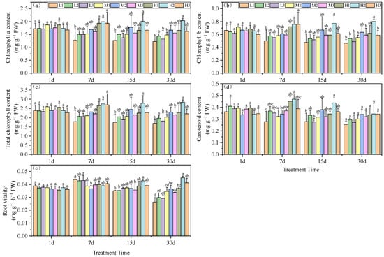 Effects of root zone pH and magnesium on tea plant seedlings. (a) Chlorophyll a, (b) chlorophyll b, (c) total chlorophyll, (d) carotenoids, and (e) root vitality. Experimental hydroponics modifications were as follows: series 1–pH 3.5 and Mg, 0.01 (L1), 0.4 (M1) and 0.8 (H1); series 2–pH 5.0 and Mg2+, 0.01 (L2), 0.4 (M2) and 0.8 mM (H2); series 3–pH 6.5 and Mg2+, 0.01 (L3), 0.4 (M3) and 0.8 mM (H3), respectively. FW: Fresh Weight. DW: Dry Weight. Mean ± SD. Different lowercase letters in the figure represent the significance of differences among treatments in the same growth period at the 0.05 level.