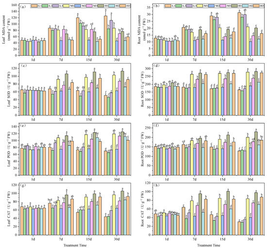Antioxidant enzyme levels (SOD, POD and CAT) and MDA content were measured as previously described, with slight modifications [30]. In brief, 0.1 g of leaf tissue (excluding the main vein) and root tissue and 3 steel balls were ground, using a mill, into a paste in 2 mL centrifuge tubes containing 50 mM phosphate buffer pH 7.8 containing 1.0% polyvinylpyrrolidone (PVP). The homogenate was centrifuged at 12,500× g for 20 min at 4 °C and antioxidant enzymes and MDA levels were measured in supernatants as follows (all assays were conducted at temperatures between 2 and 4 °C): SOD activity was measured using the nitro-blue tetrazolium (NBT) photochemical reduction method, POD activity utilized the guaiacol method, CAT activity was determined via UV absorbance, and MDA content was measured using the thiobarbituric acid (TBA) colorimetric method.