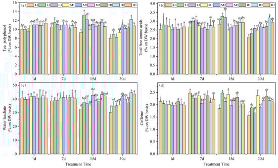 Effects of altered root zone pH and magnesium supplementation on tea plant physiological markers. (a) Polyphenols, (b) free amino acids, (c) water leachate content and (d) caffeine. See Figure 1 legend for abbreviations. Note: different lowercase letters in the figure represent the significance of differences among treatments in the same growth period at the 0.05 level.