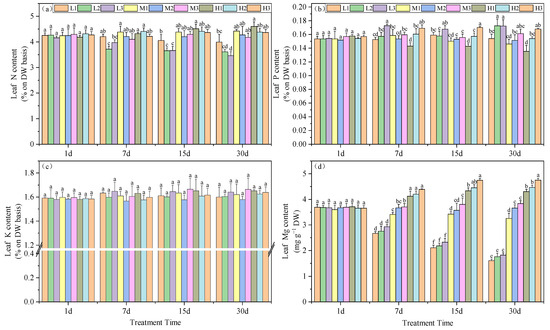 The P content in leaves was also significantly increased as the Mg levels were increased, although at 0.8 mM Mg, P levels decreased with time. On day 30, Mg deficiency without acid stress (L2 and L3) and high-pH treatments under normal Mg conditions (M3 and H3) facilitated the accumulation of P, which increased by 14.1, 14, 6.5 and 10.9%, respectively, compared to M2. Furthermore, under conditions of equivalent Mg, acid stress had a detrimental impact on the accumulation of P in the leaves (Figure 4b). In contrast, K levels did not vary for any of the experimental treatments (Figure 4c).