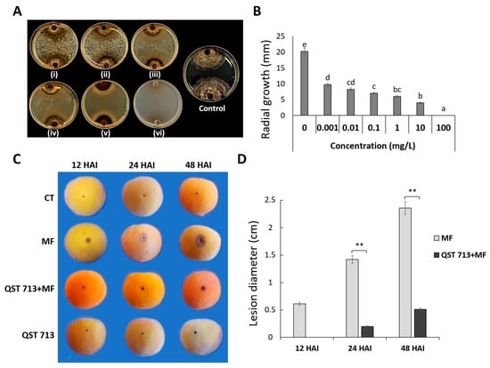 3.1. Inhibitory Effect of Bacillus Amyloliquefaciens QST 713 on M. fructicola Growth In Vitro and Disease Severity on Peach Fruits