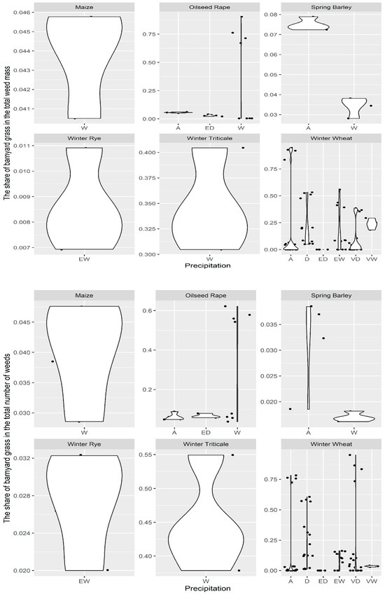 Violin plots of the proportion of barnyardgrass mass and number of individuals in the total mass and number of weeds depending on the previous crop used and the degree of moisture of the previous crop as well as the degree of moisture. Category of humidity: EW—extremely wet; VW—very wet; W—wet; A—average; D—dry; VD—very dry; ED—extremely dry.