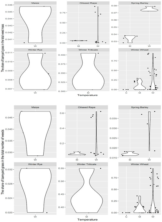 The type of thermal conditions also affects the share of barnyardgrass mass and number of individuals in the total number of weeds (Figure 2). In a temperate year (M), the share of weed mass and number was most often lower than in a warm year (W) after the previous crops: spring barley, wheat, and winter oilseed rape. However, the values of these traits vary widely, e.g., in warm years the share of the weight of individuals of barnyardgrass was in the range 0.000–0.80; the same is true for the share of the number of individuals of this weed species for winter wheat.
