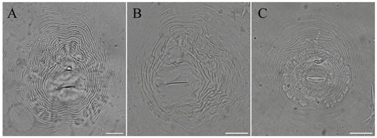The perineal patterns of females. (A,B) Perineal patterns of females extracted from infected Polygonatum sibiricum; (C) perineal pattern of females extracted from infected Peucedanum praeruptorum. The scale bars in the image are 160 pixels.