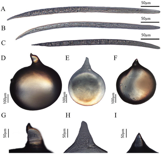Representative morphological characteristics of Meloidognye spp, including whole second-stage juvenile (A–C), whole female (D–F), and female neck (G–I). (A,D,G) Representative morphological characteristics of Population I from Polygonatum sibiricum; (B,E,H) representative morphological characteristics of Population II from Polygonatum sibiricum; (C,F,I) representative morphological characteristics of Population III from Peucedanum praeruptorum.