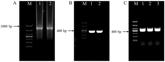 Additionally, PCR amplification was performed for all the individual female samples from P. sibiricum analyzed using species-specific primers MiF/MiR and Far/Rar, which produced 999 and 420 bp products for M. incognita and M. arenaria, respectively (Figure 3A,B). M. hapla-specific primers (JMV1/JMVhapla.) amplified the female samples of P. praeruptorum, producing a 440 bp amplification product of the same size as M. hapla (Figure 3C). These sequences of the amplified product were submitted to GenBank for a BLAST search, and the sequences (GenBank accession no. PP259100, PP236047, and PP259099) revealed the highest similarity (≥99.74%) to sequences of M. incognita, M. arenaria, and M. hapla, respectively.
