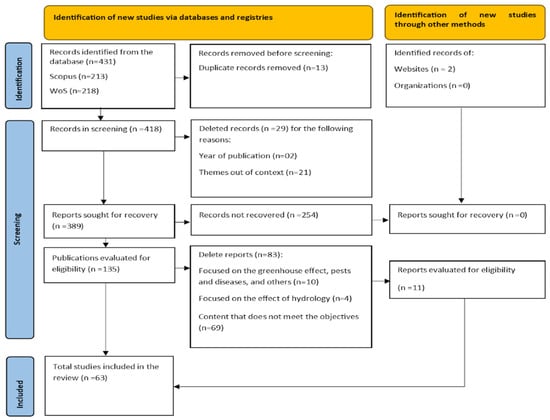 All studies identified in the search were entered into the reference management software Mendeley Desktop and reconfirmed by human verification. In the first stage, 13 publications were excluded as duplicates, which corresponds to 3% of the total (431) publications identified via databases. In the second stage, 29 publications, corresponding to 6.7%, were excluded due to the following: (i) year of publication (0.46%), (ii) topics outside the study context (4.85%), (iii) articles from a systematic review (1.39%), and inaccessible documents (58.93%). In the third stage, 10 articles, corresponding to 2.3%, focused on the greenhouse effect, pests, and pesticides, 4 articles, corresponding to 0.93%, focused on the effect of climate change on hydrology, and finally, 69, corresponding to 16%, whose contents did not align with the objectives of this review, were excluded.