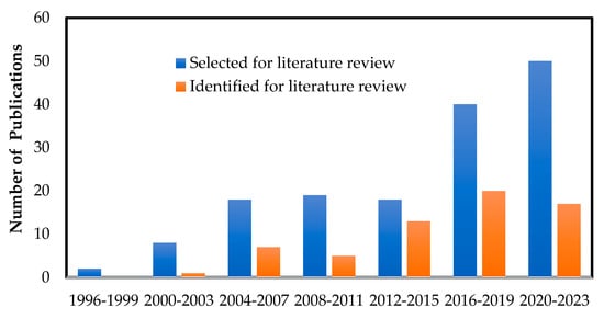 Figure 2. Annual numbers of documents identified by literature search (1996–2023) and selected/included for the literature review.
