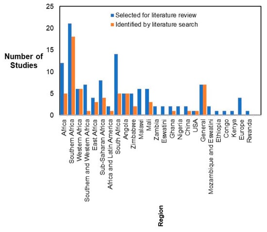 Figure 3. Number of publications related to each country in the study region (Southern Africa) identified by the literature search and selected/included for the literature review (1996–2023).