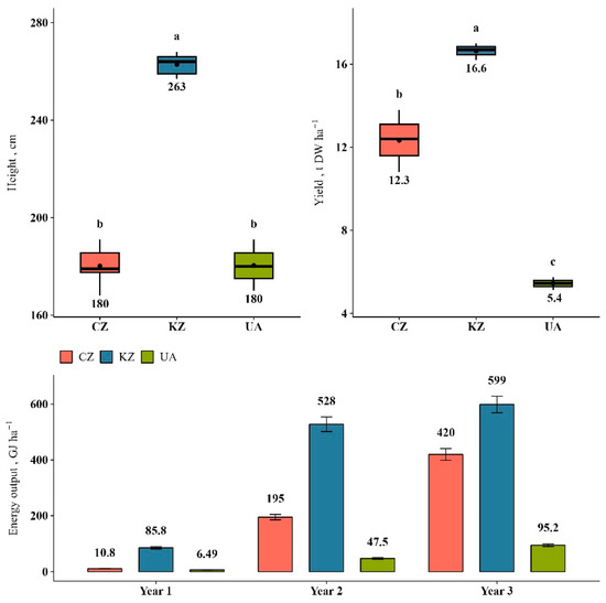 The height, harvest value, and energy output of M × g biomass produced at the research fields. Different letters within one parameter serve as statistical groups and indicate significant differences.