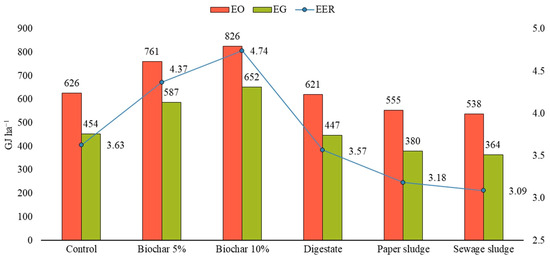 The values of energy output, gain, and efficiency ratio were calculated in accordance with Jankowski et al. [54] and Sokólski et al. [53]. The results showed that the best energy characteristics were obtained for biomass produced in soil with biochar amendments and increasing the biochar application rate from 5 to 10% led to better energy characteristics (Figure 2). The energy efficiency ratio for biomass produced in soil amended by 5% biochar overcame the control’s values by 20.5%, and for 10% biochar, the increase was 30.8%. The incorporation of other soil amendments (digestate, paper mill sludge, and sewage sludge) decreased the energy efficiency ratio by 1.65–14.9%. This fact illustrated that the incorporation of biochar is the best tool for enhancing biomass energy characteristics when M × g phytotechnology is applied to non-agricultural land, including brownfields.